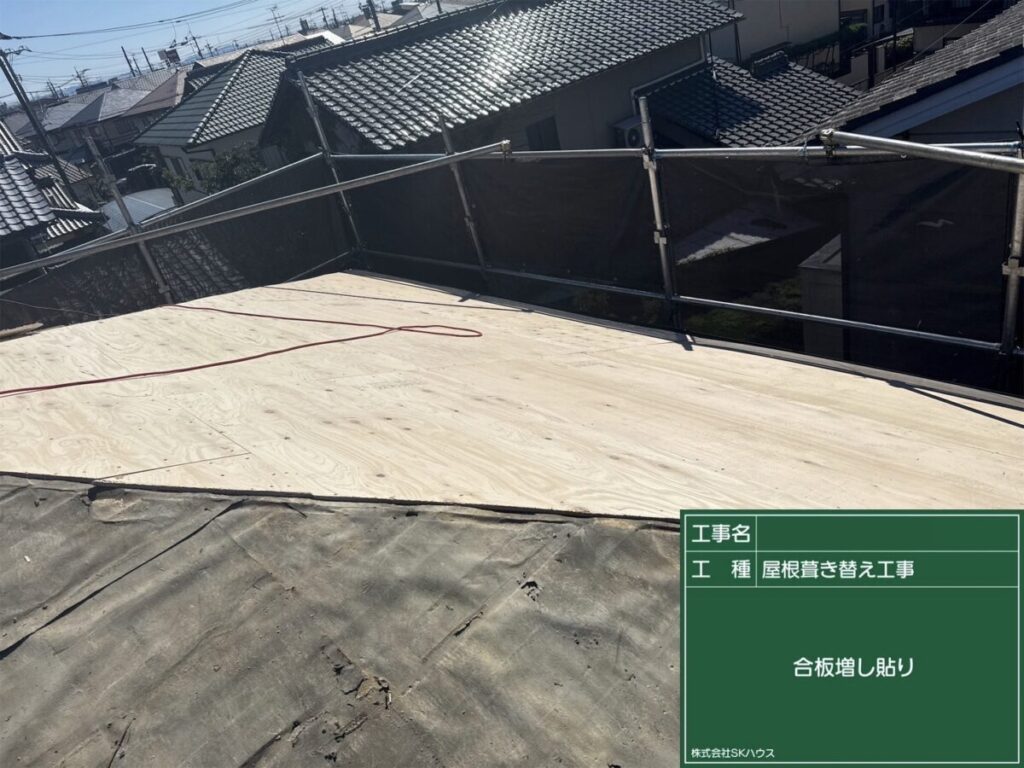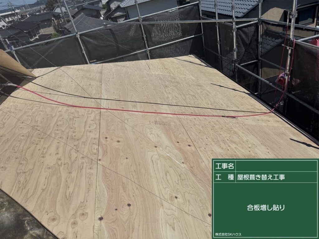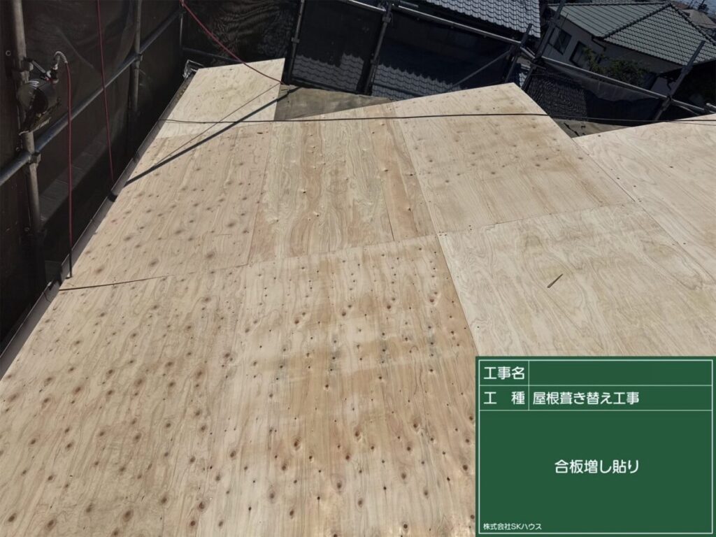 屋根下地の補強として、新たに合板を増し貼り。