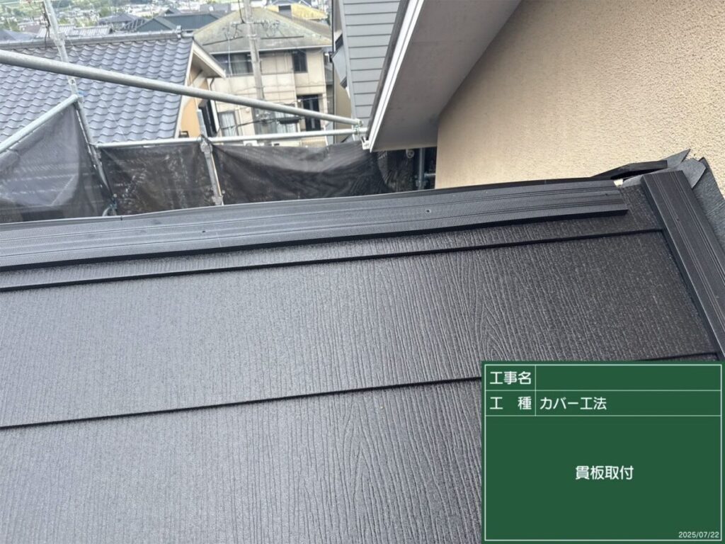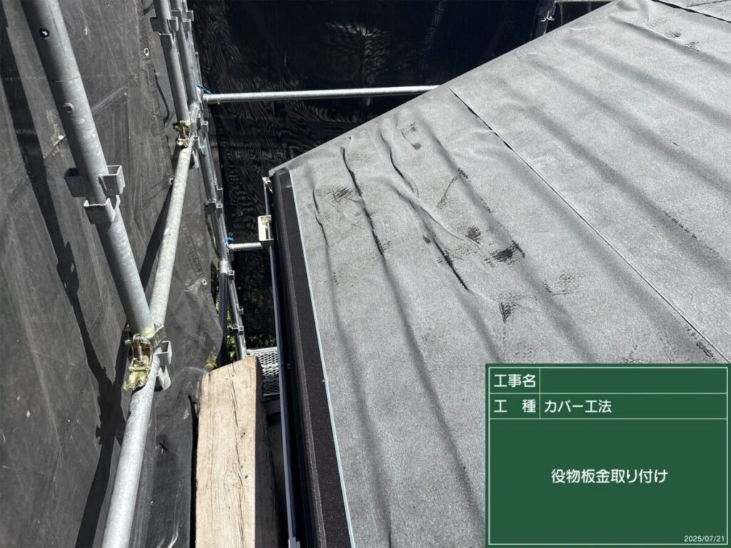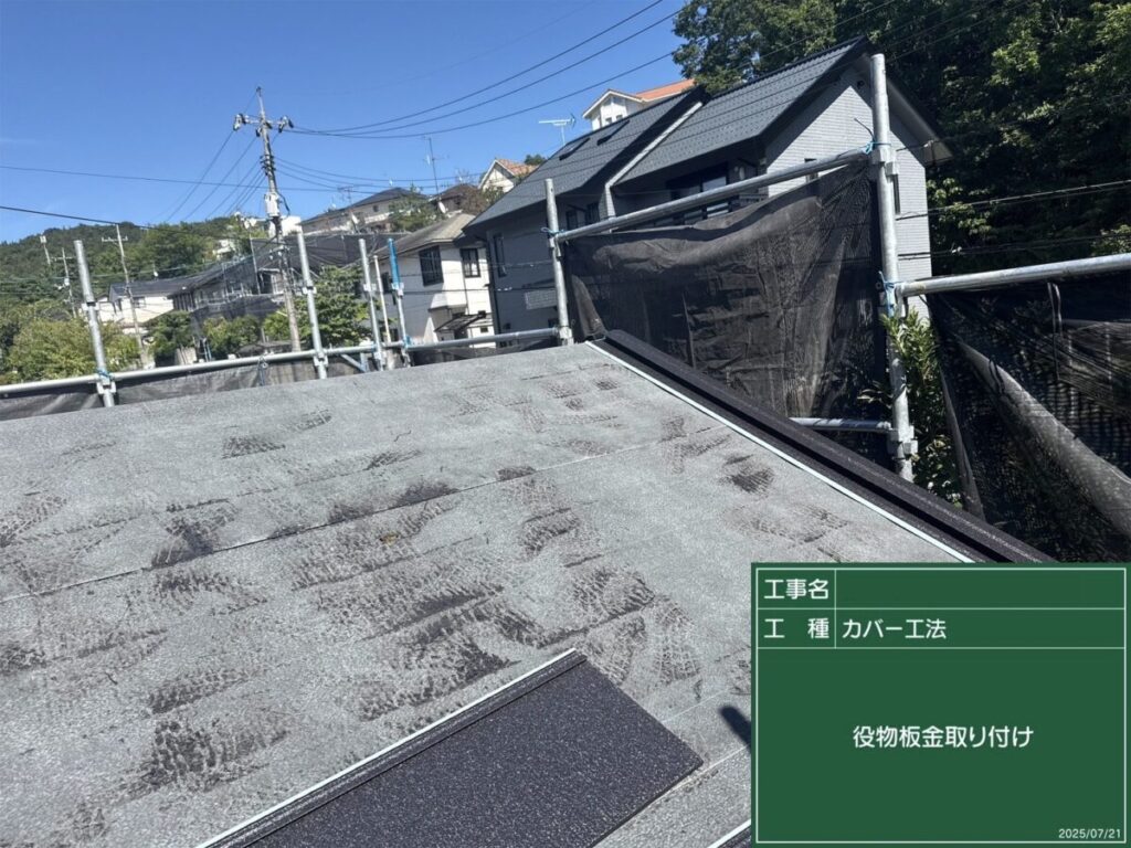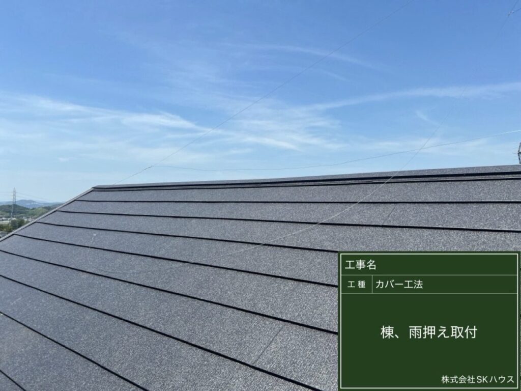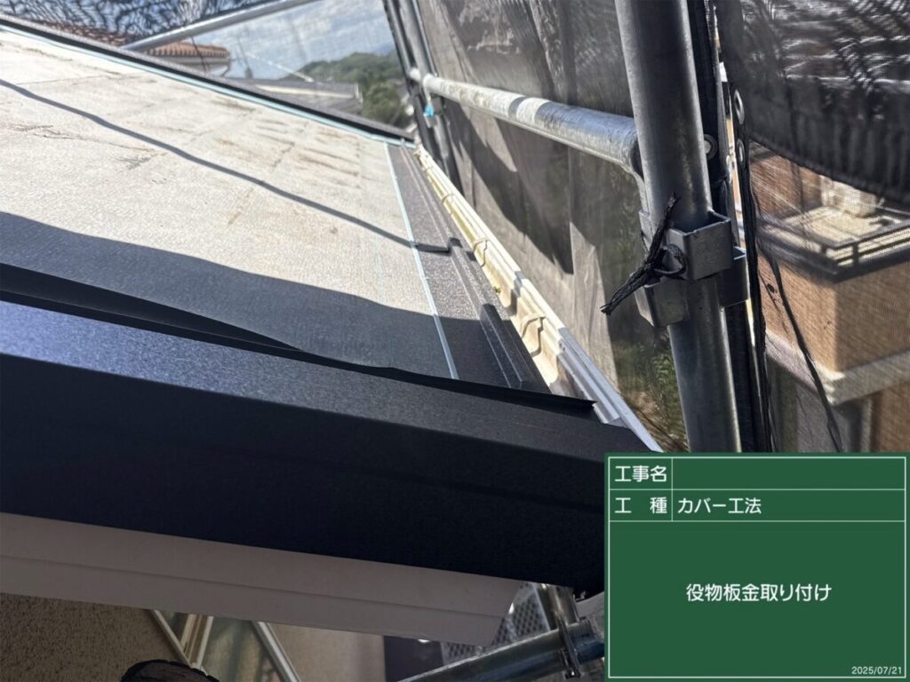 棟板金と雨押え板金を取り付け、屋根全体をしっかり仕上げます。
