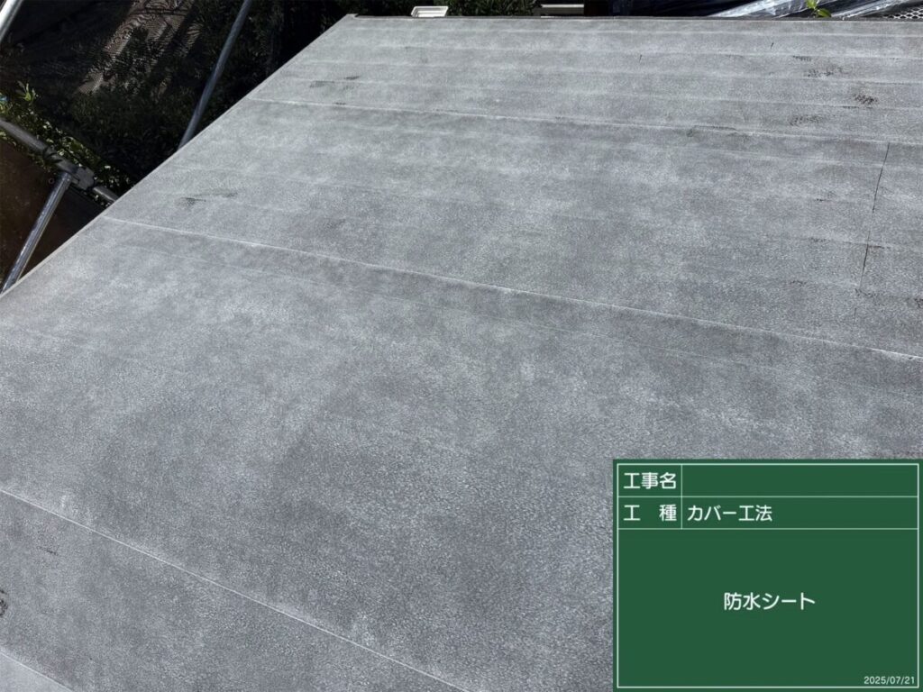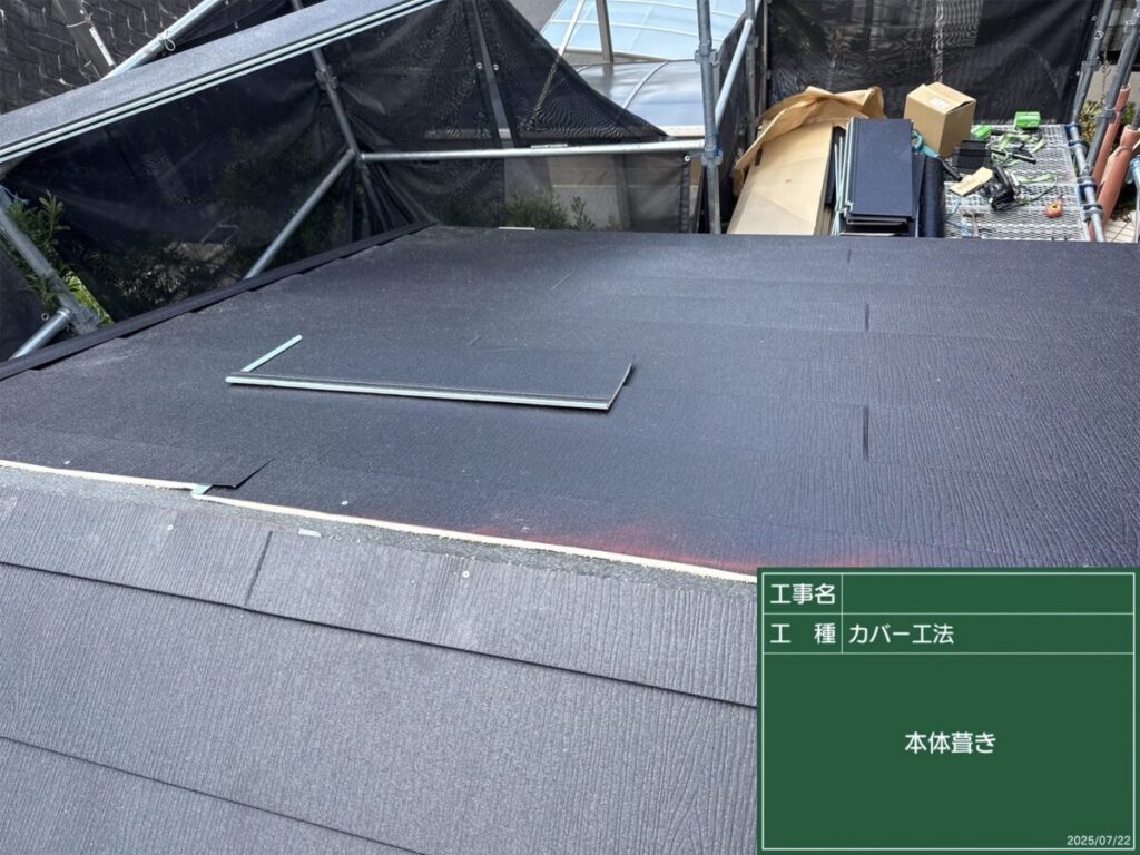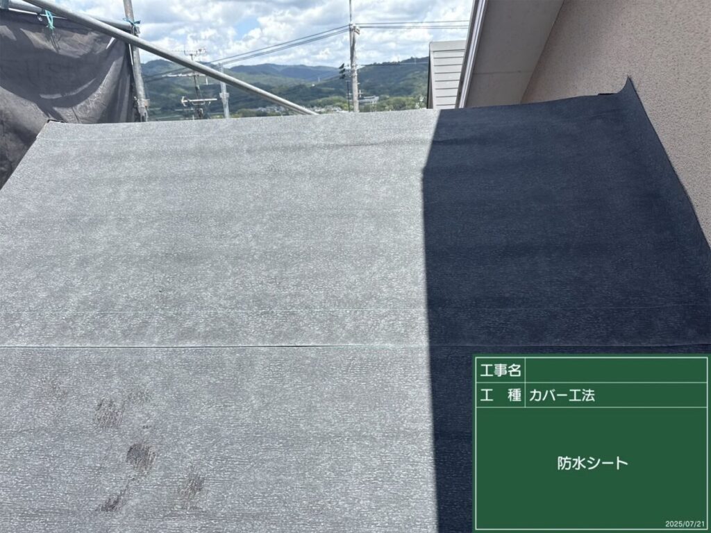 既存屋根の上から防水シートを丁寧に施工。