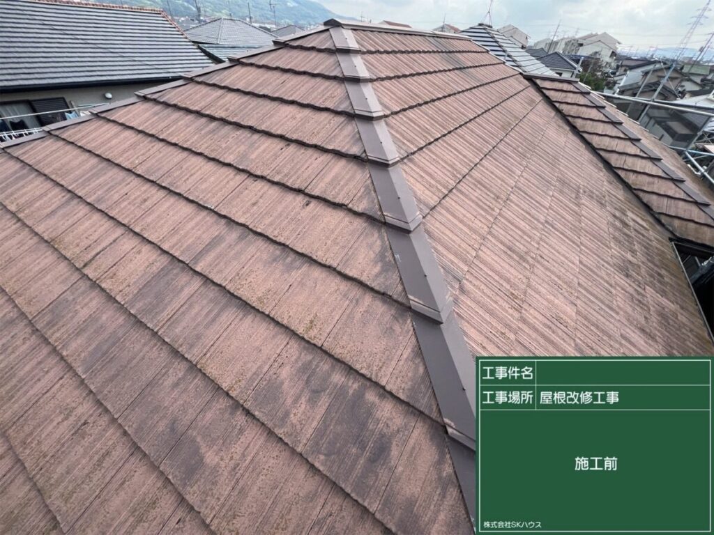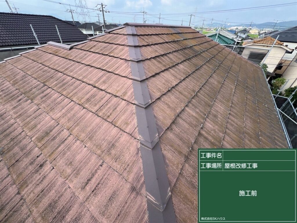 施工前は、屋根全体に色褪せやコケの発生が見られ、防水性能の低下が懸念される状態でした。