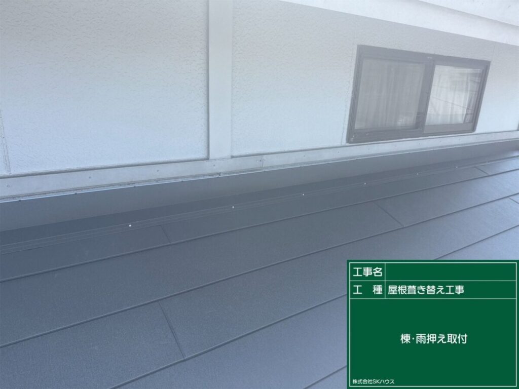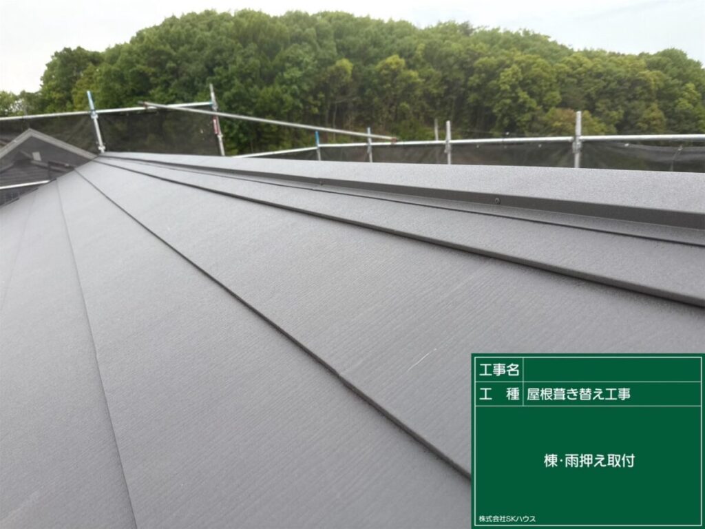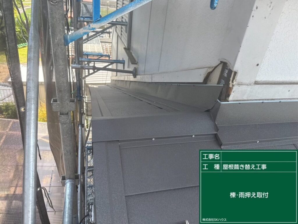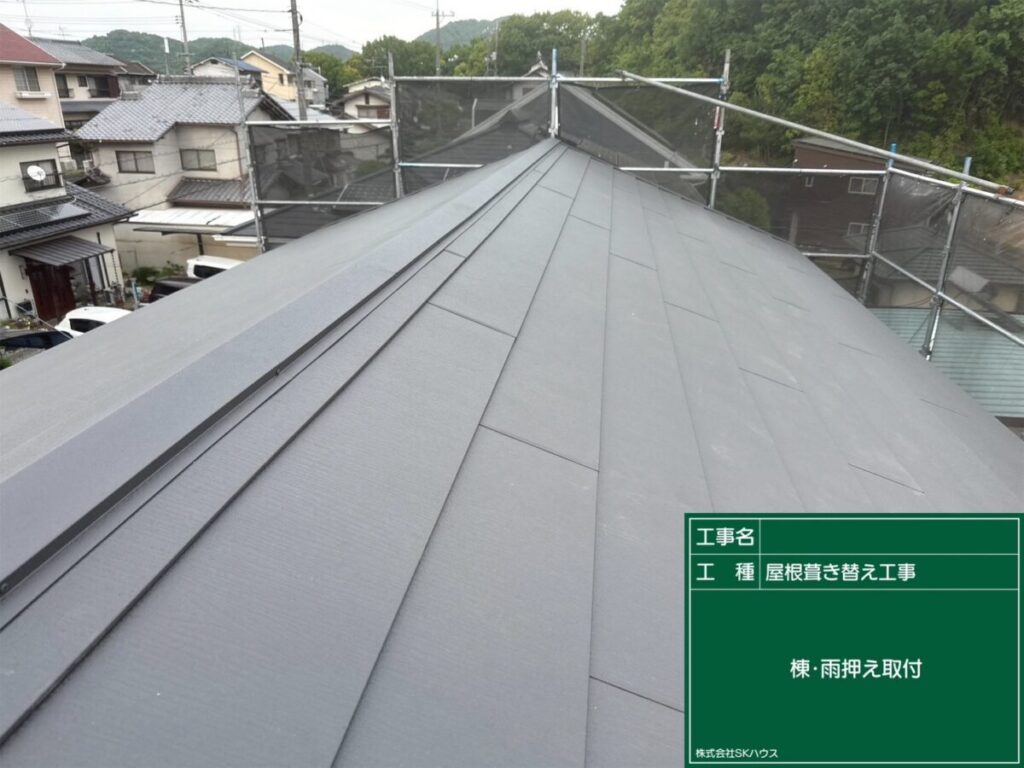 棟板金の取り付けが進み、屋根がしっかりと仕上がってきました。