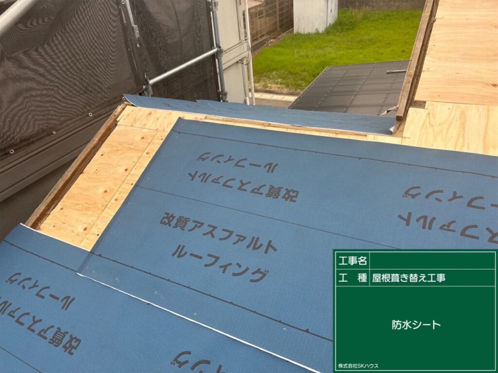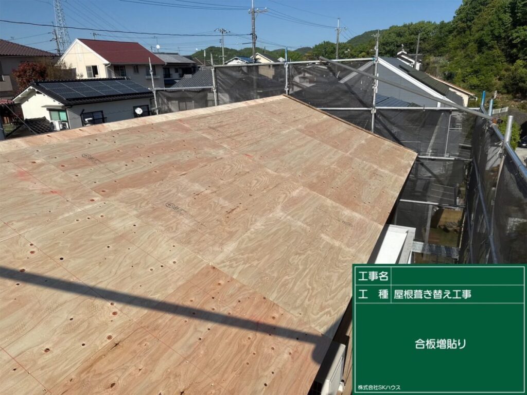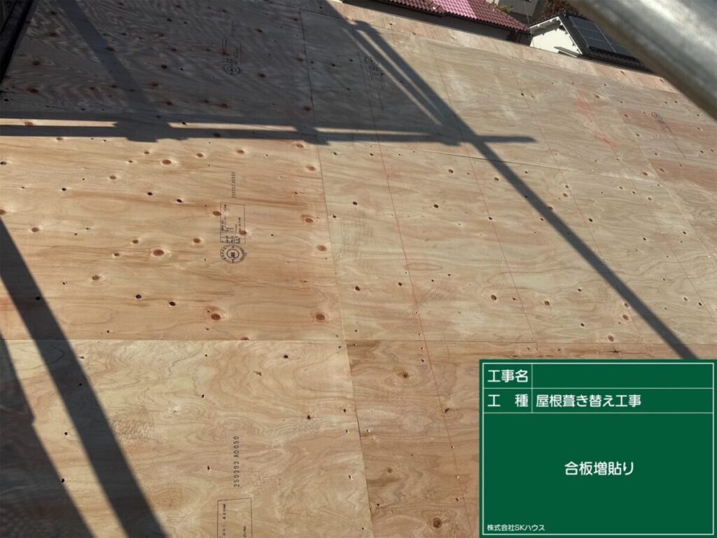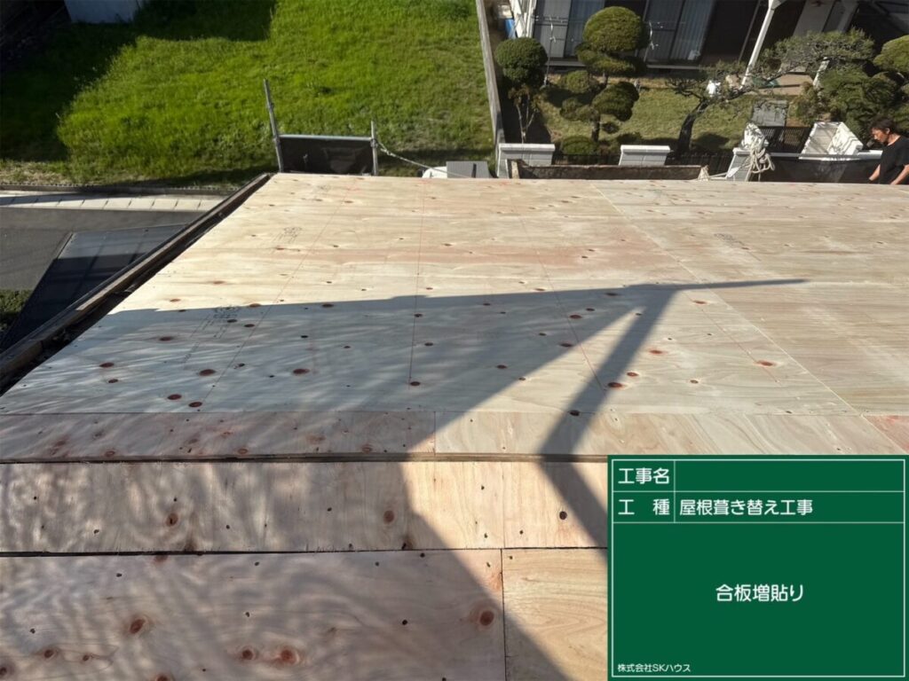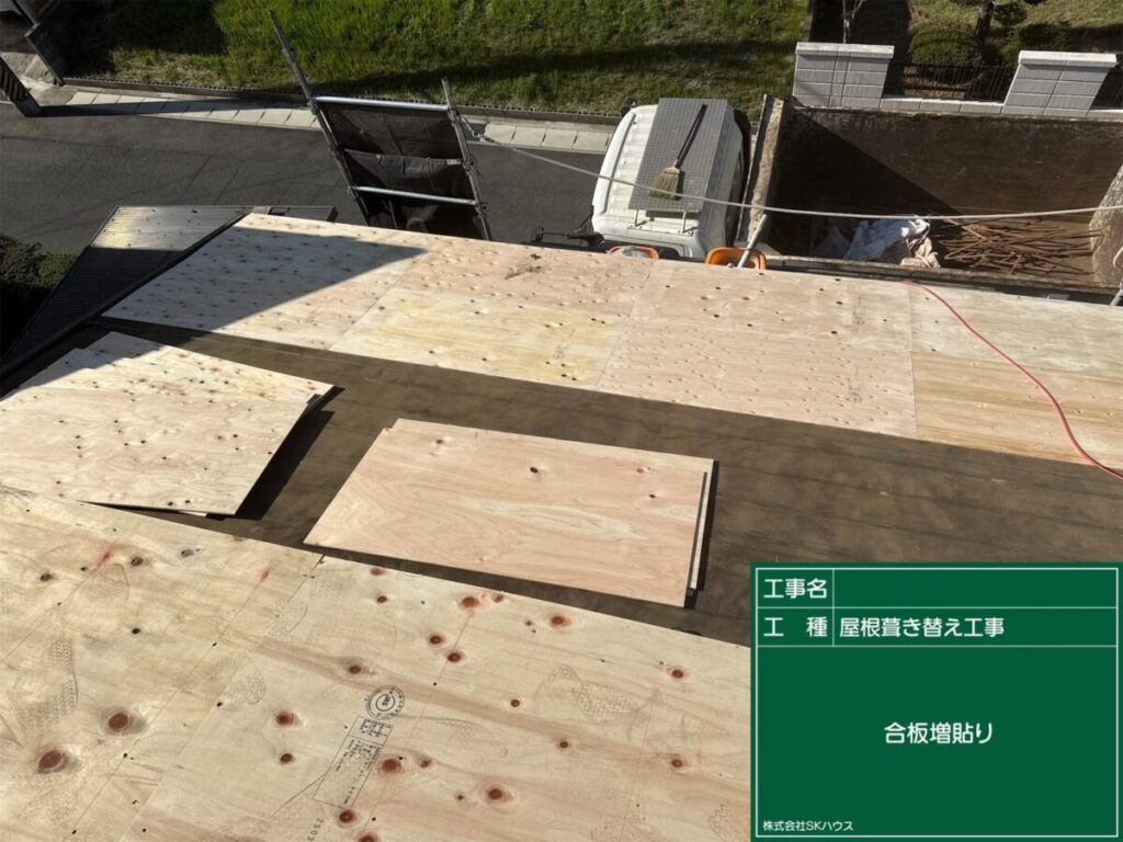 屋根下地を補強するため、新しい合板を施工中です。