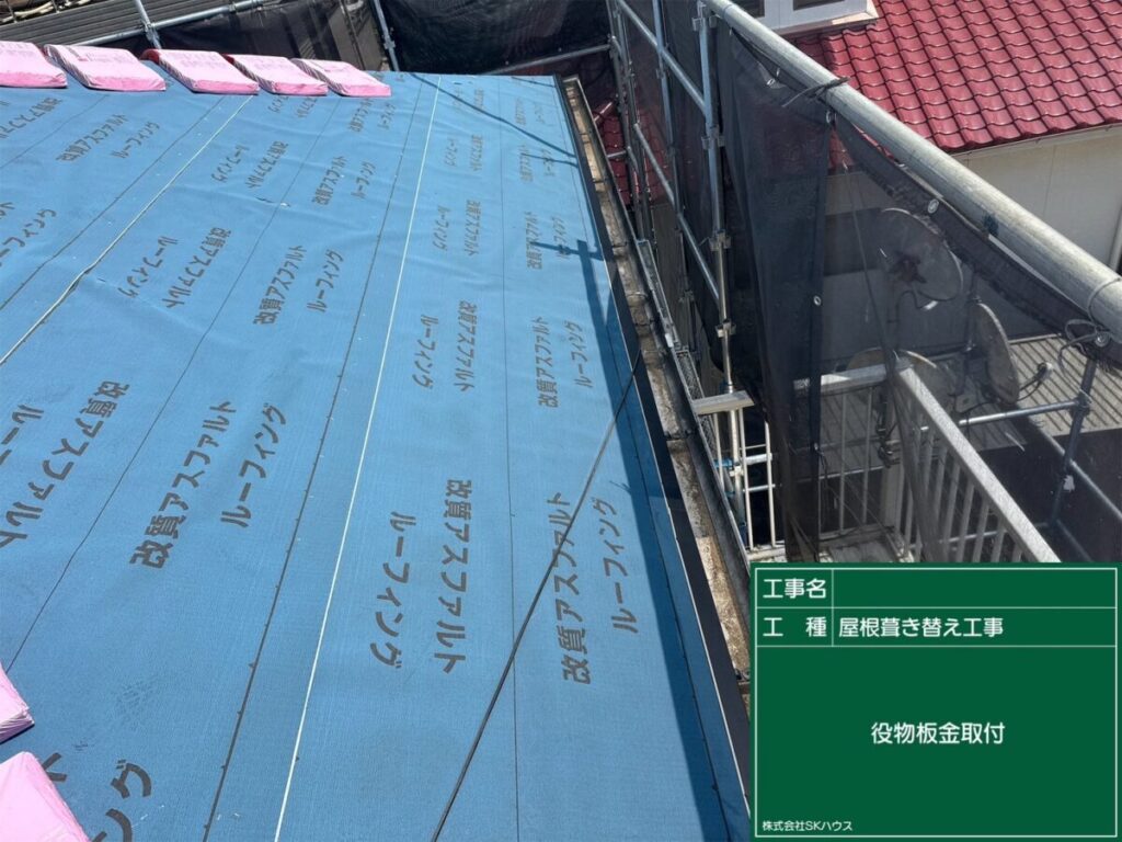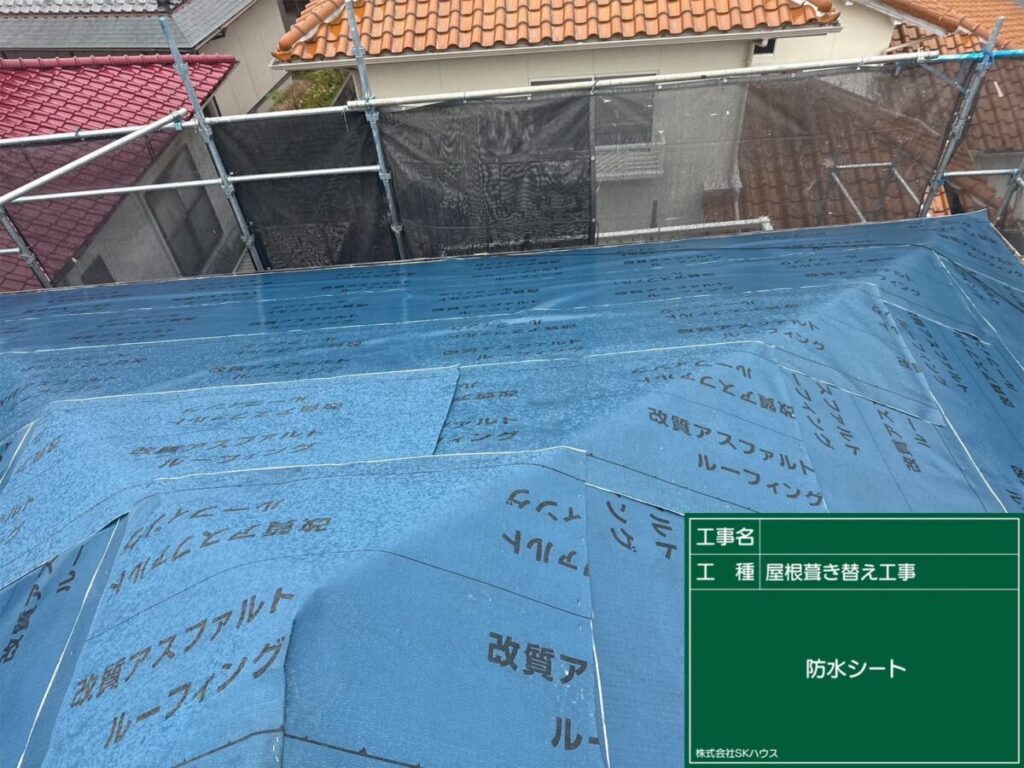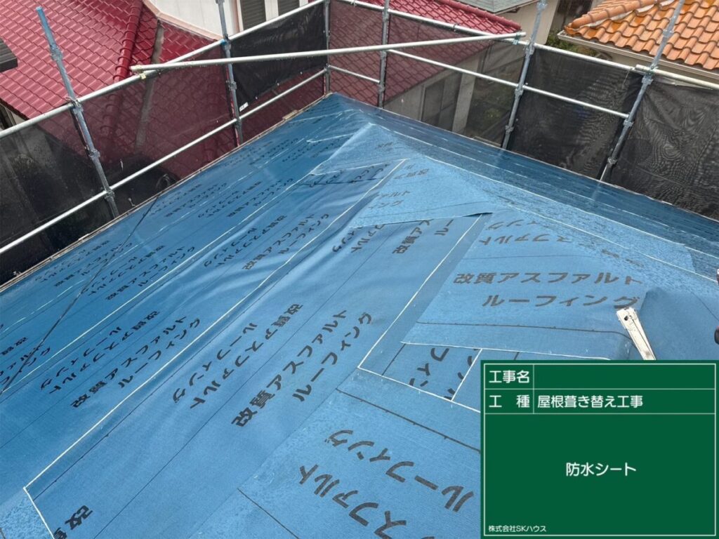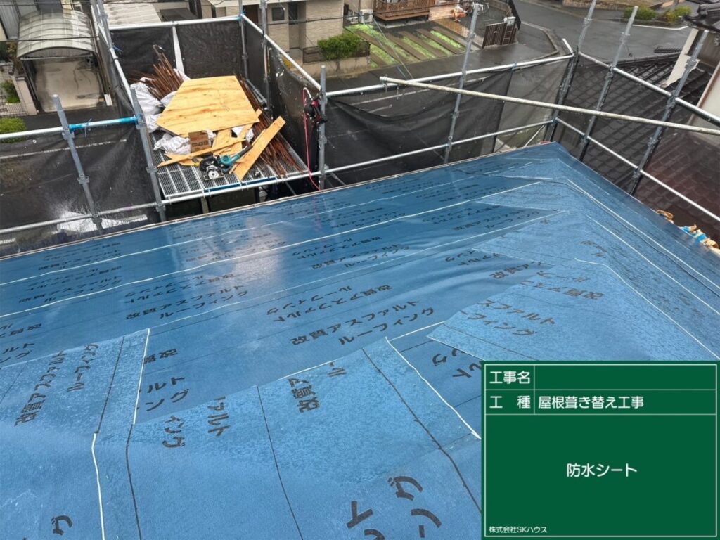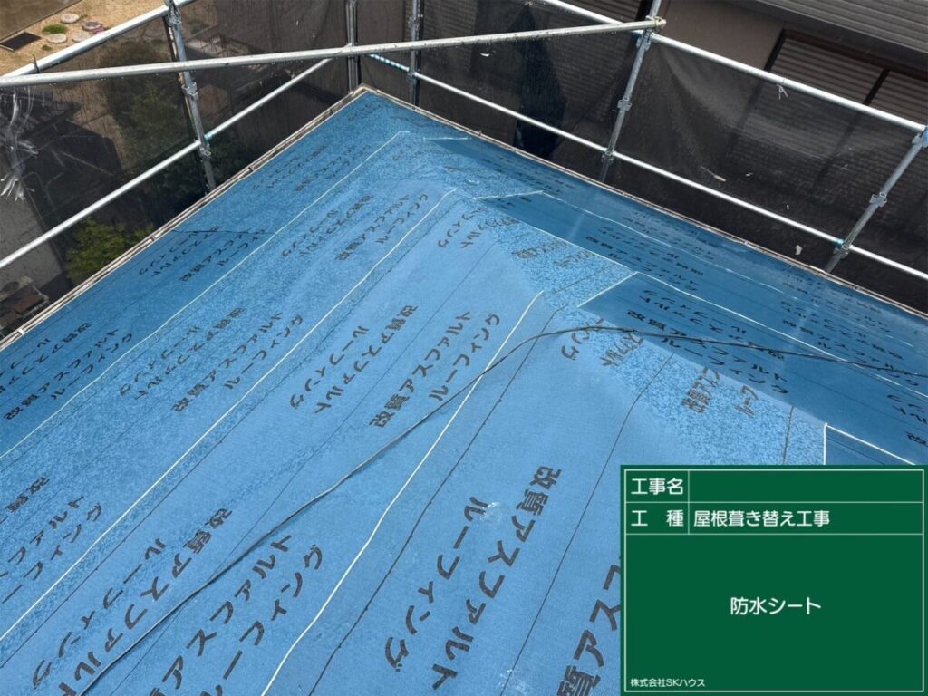 新しい防水シートを丁寧に貼り、雨漏りを防ぐ大切な工程です。