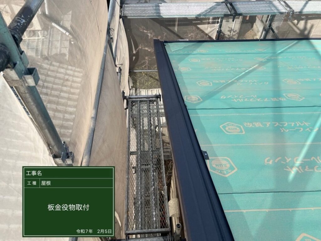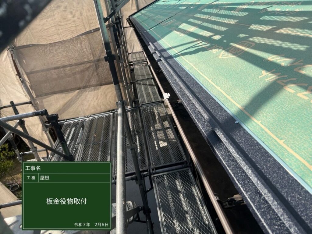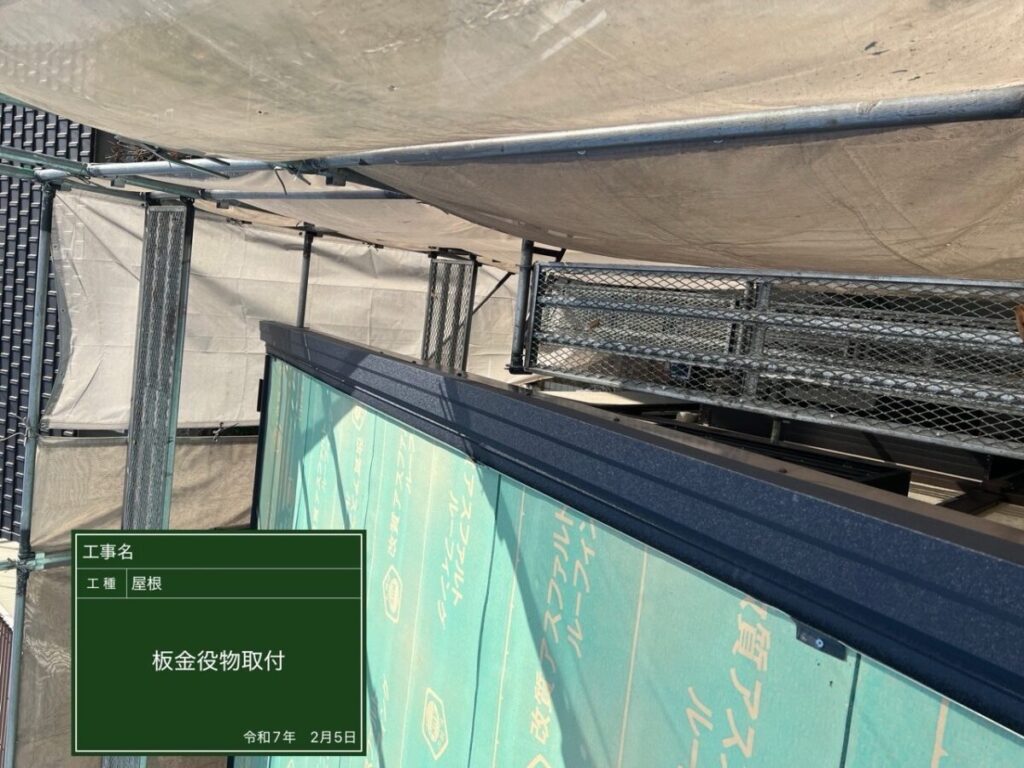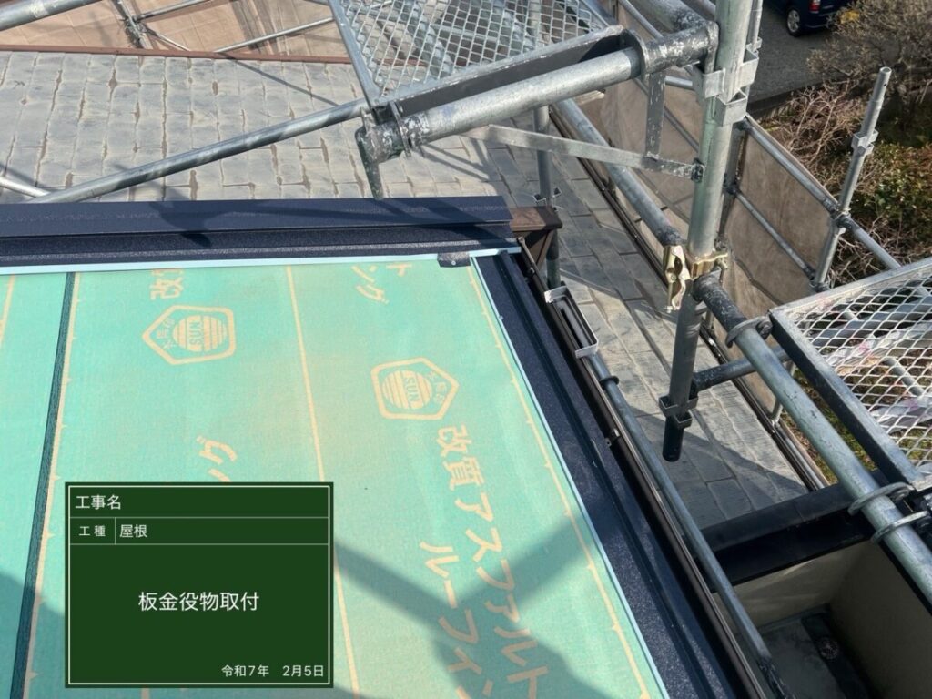 屋根の端まわりに板金を取り付けています。雨水の侵入を防ぐ大切な工程です。