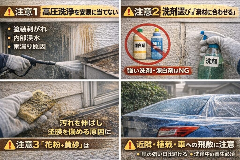 外壁材(窯業系サイディング、モルタル、金属系、タイルなど)によって相性があります。強い洗剤や漂白剤を使うと、変色・ムラ・白化の原因になります。